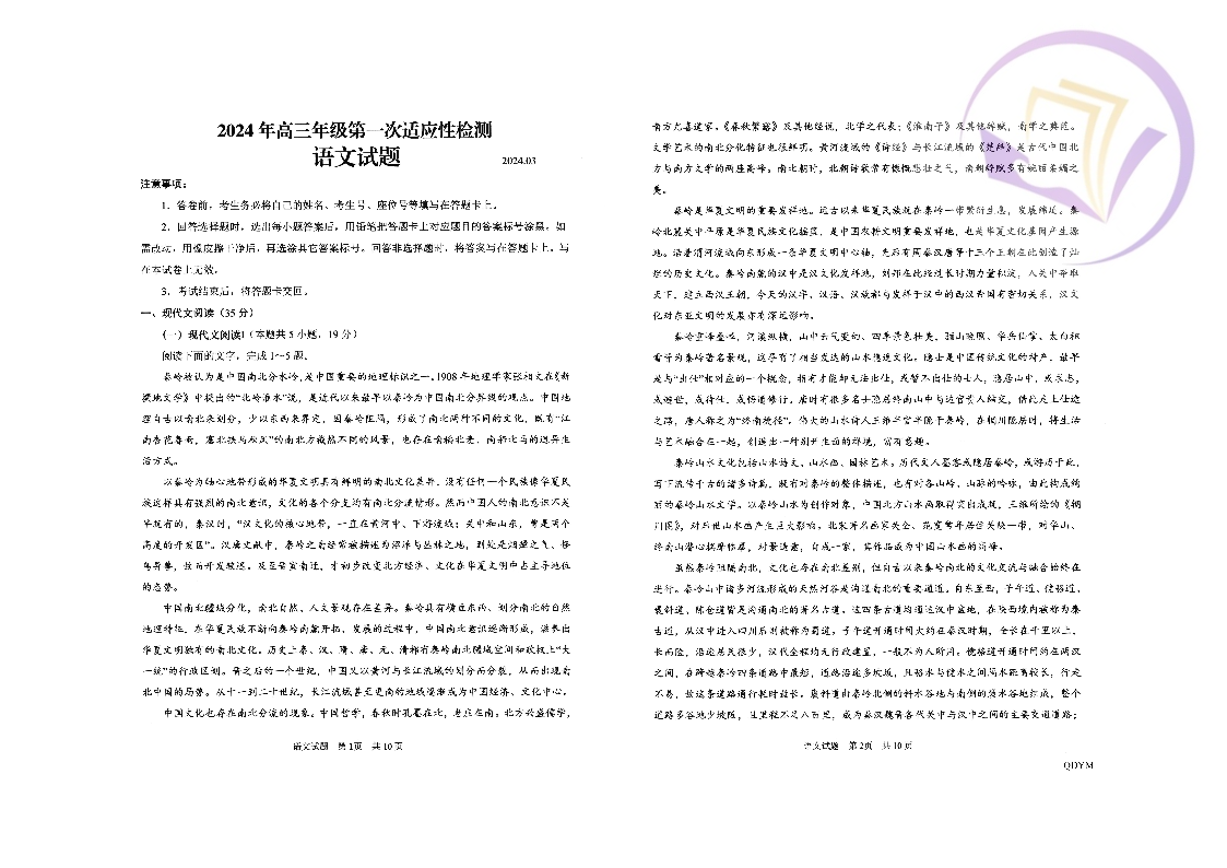 1山东省青岛市2024.3高三年级第一次模拟语文