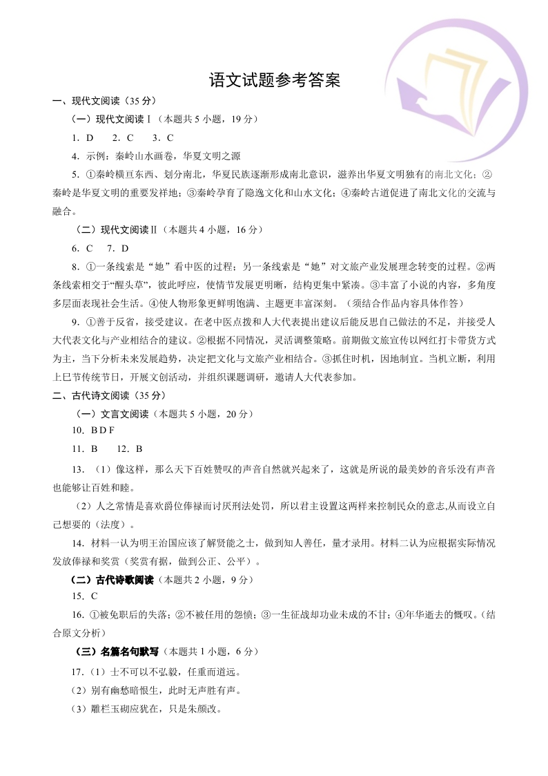 1山东省青岛市2024.3高三年级第一次模拟语文答案