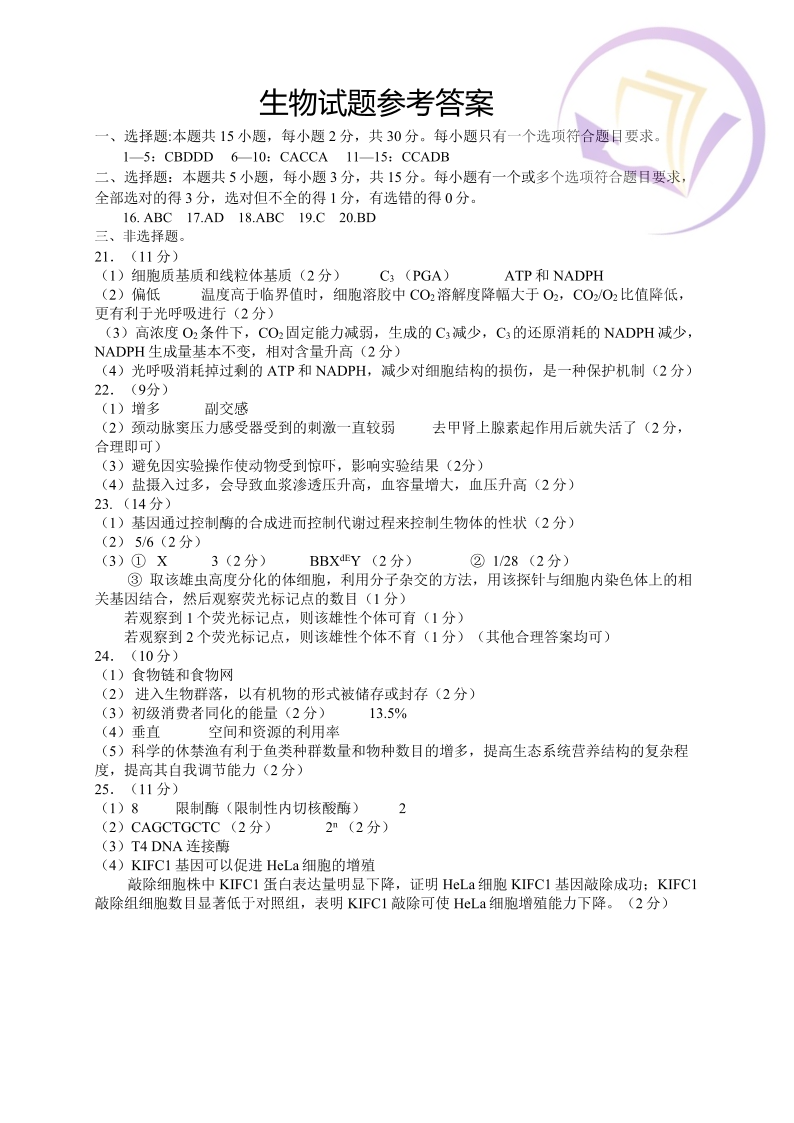山东省青岛市2024.3高三年级第一次模拟生物答案