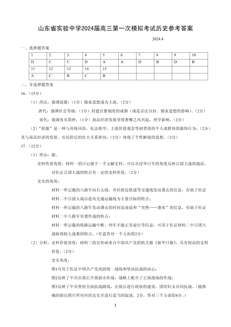 山东省实验中学2024.4高三年级第一次模拟历史答案