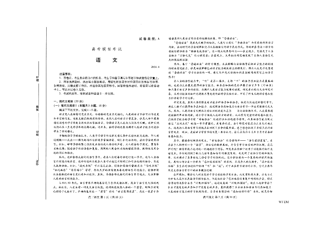 1山东省潍坊市2024.4高三年级第二次模拟语文