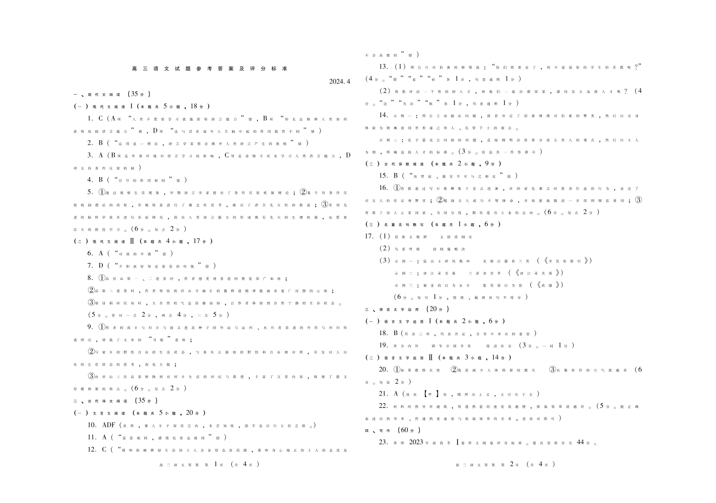 1山东省潍坊市2024.4高三年级第二次模拟语文答案
