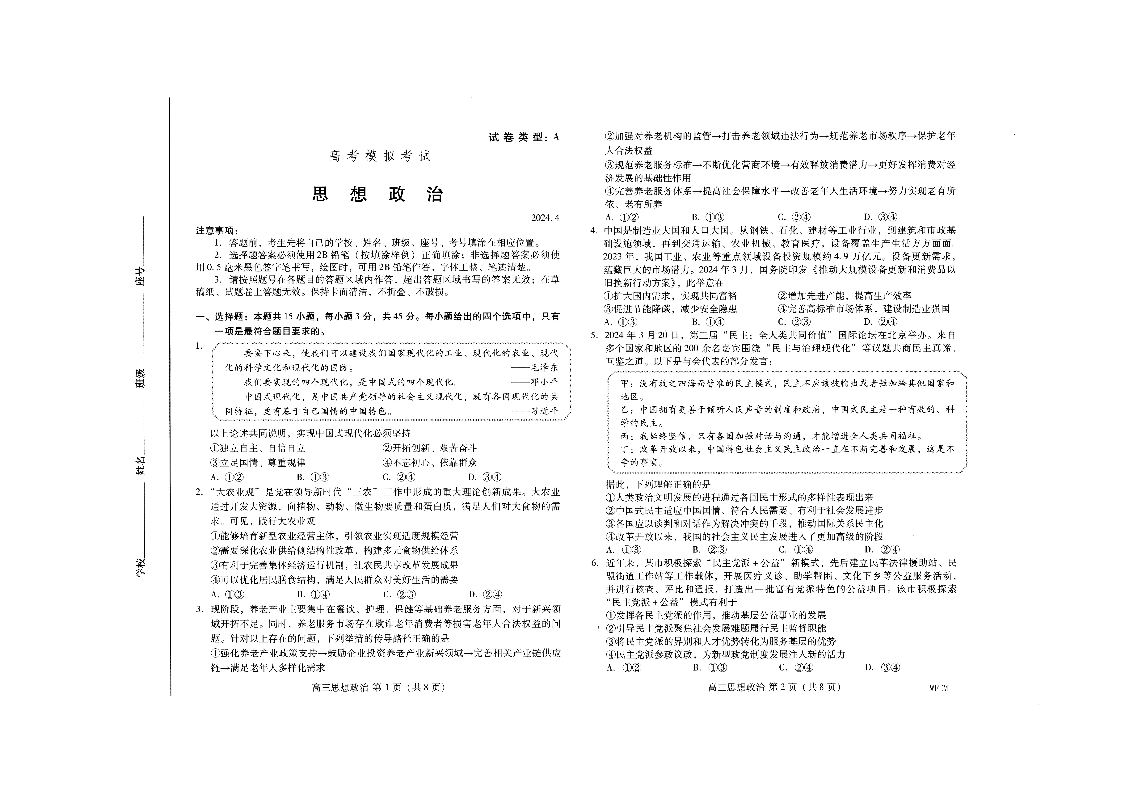 山东省潍坊市2024.4高三年级第二次模拟政治