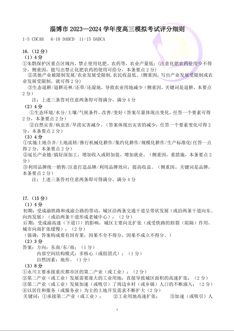 山东省淄博市2024.4高三年级第二次模拟地理答案