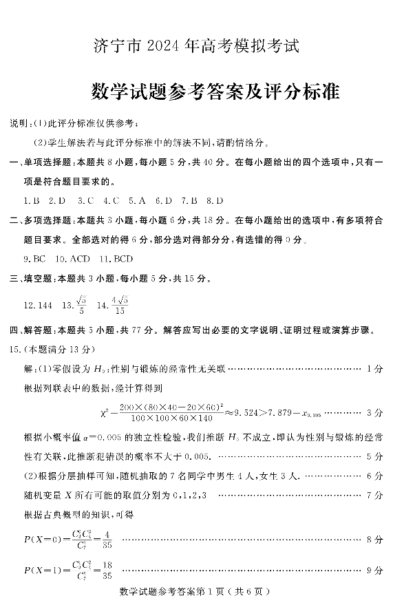 2山东省济宁市2024.4高三年级第二次模拟数学答案