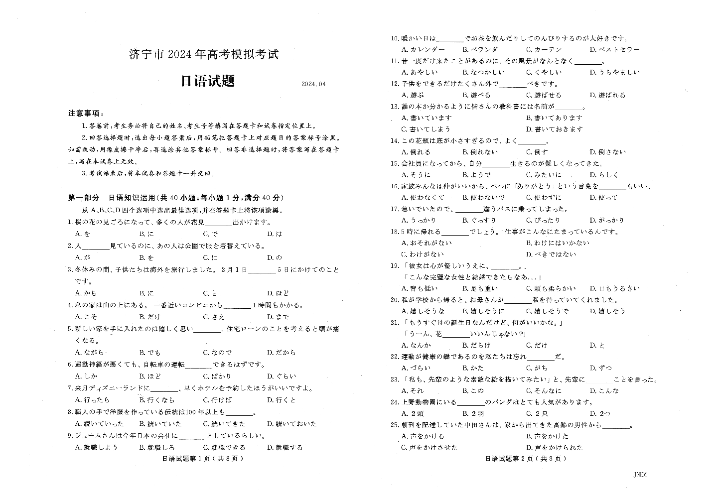 4山东省济宁市2024.4高三年级第二次模拟日语
