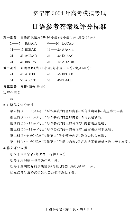 4山东省济宁市2024.4高三年级第二次模拟日语答案