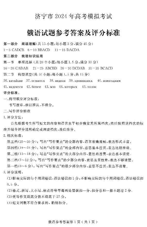5山东省济宁市2024.4高三年级第二次模拟俄语答案