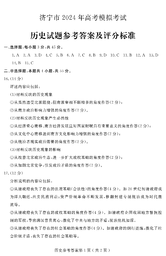 山东省济宁市2024.4高三年级第二次模拟历史答案