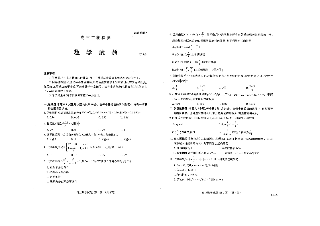 2山东省泰安市2024.4高三年级第二次模拟数学