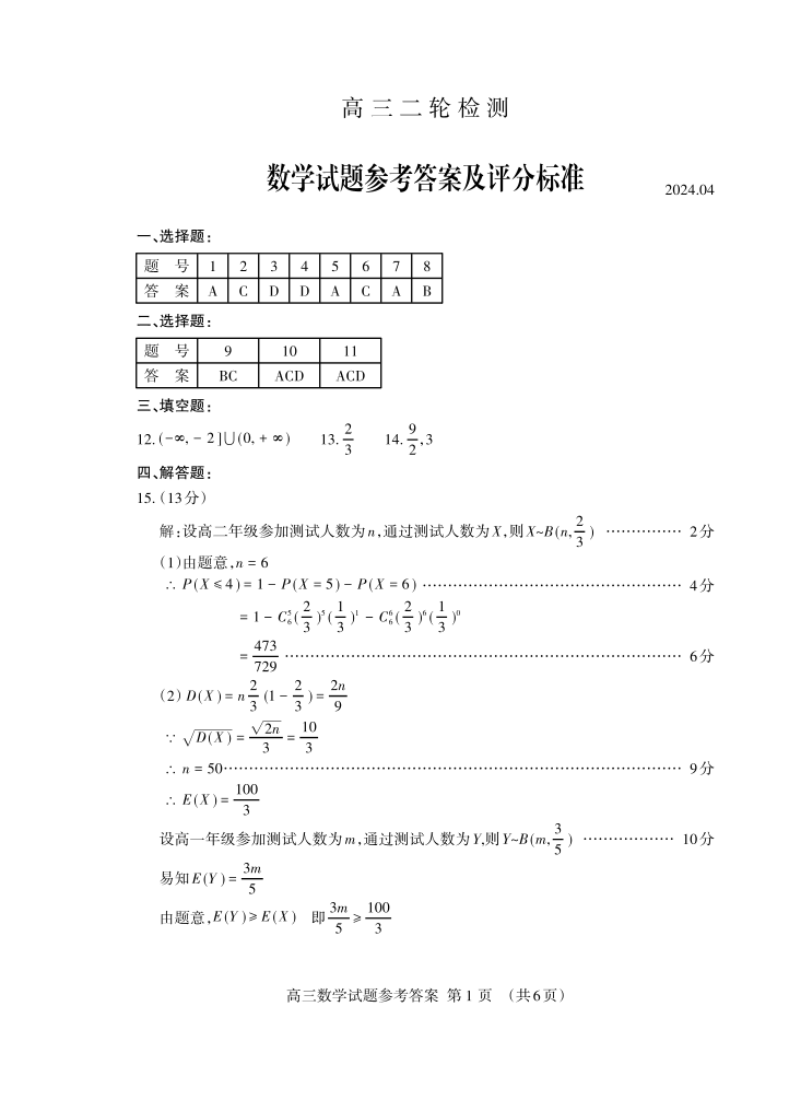 2山东省泰安市2024.4高三年级第二次模拟数学答案