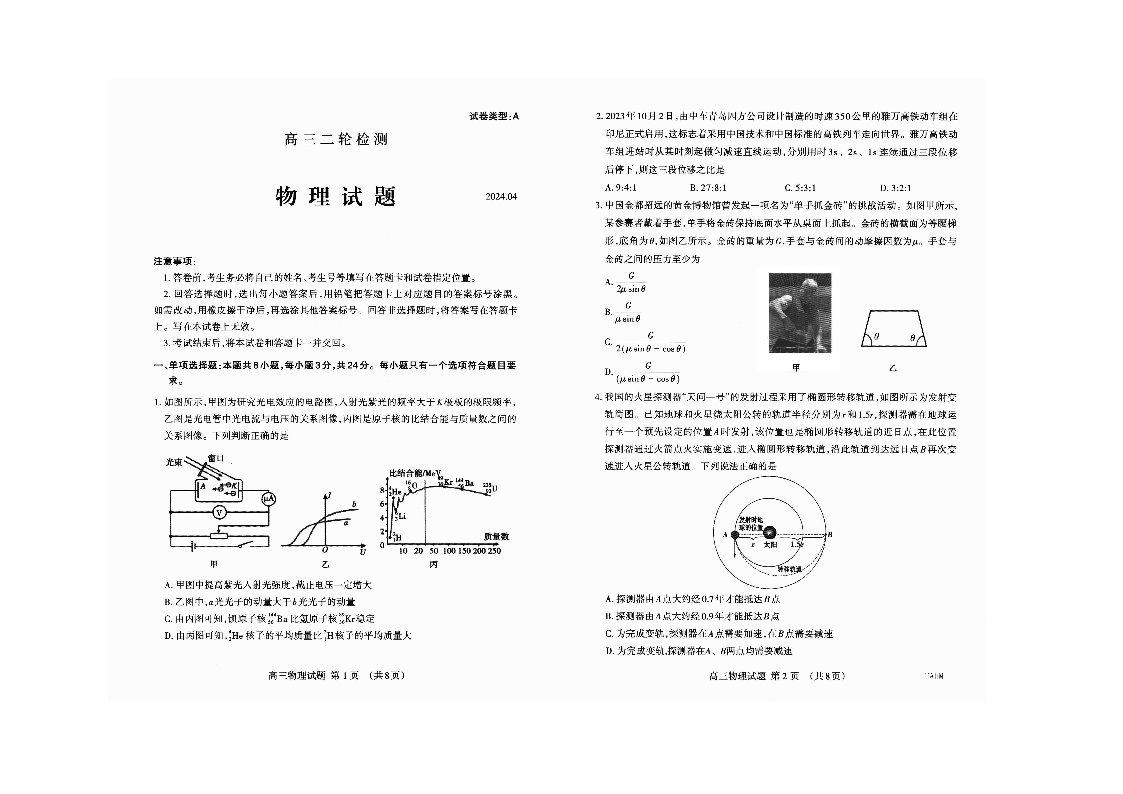 山东省泰安市2024.4高三年级第二次模拟物理