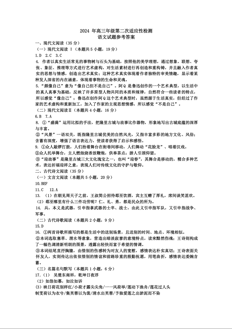 1山东省青岛市2024.5高三年级第二次模拟语文答案