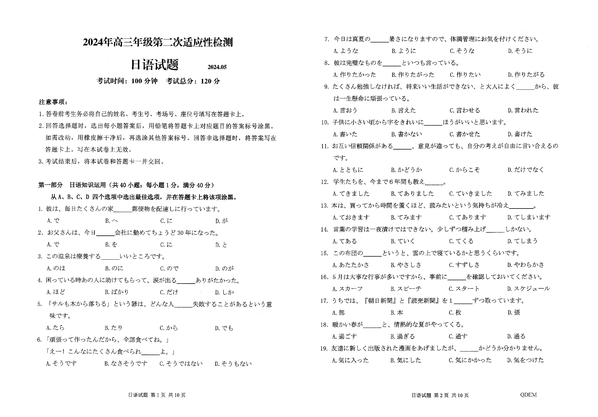 4山东省青岛市2024.5高三年级第二次模拟日语
