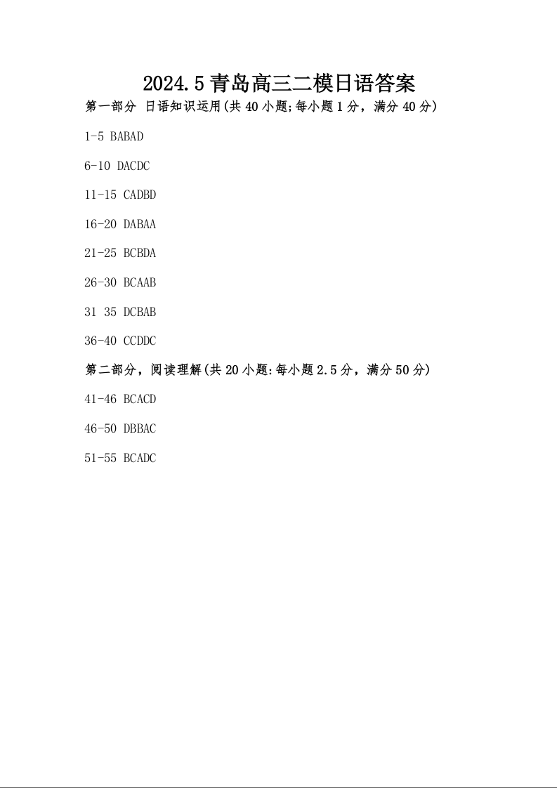 4山东省青岛市2024.5高三年级第二次模拟日语答案