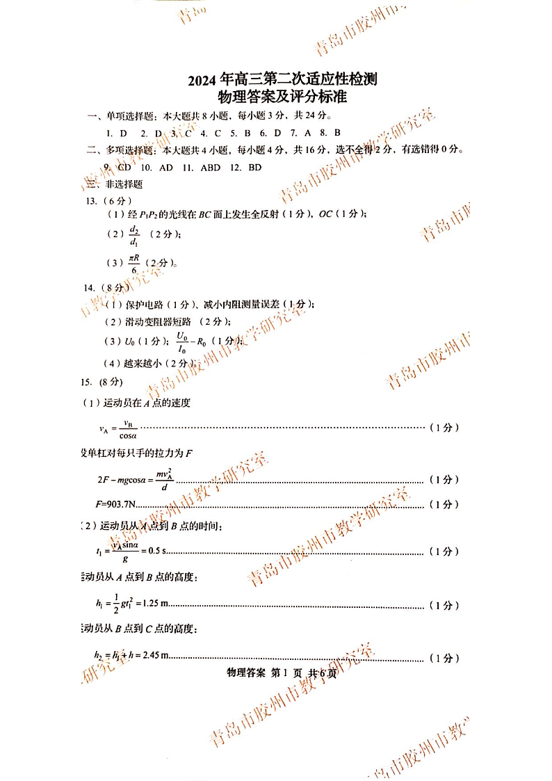 山东省青岛市2024.5高三年级第二次模拟物理答案