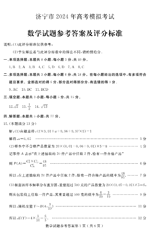 2山东省济宁市2024.5高三年级第三次模拟数学答案