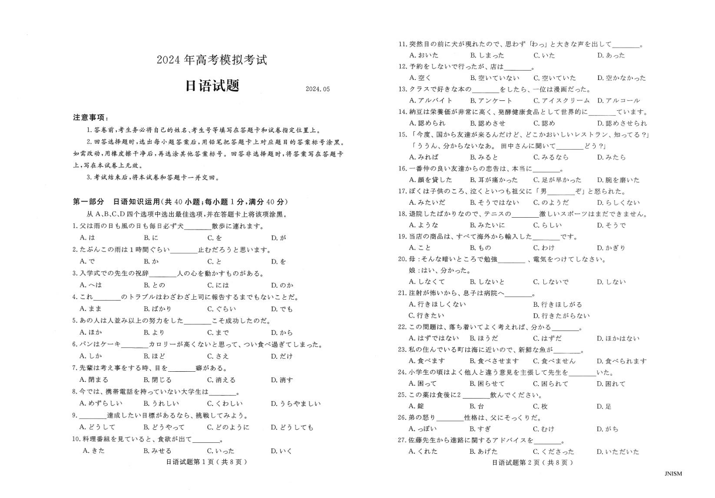 4山东省济宁市2024.5高三年级第三次模拟日语