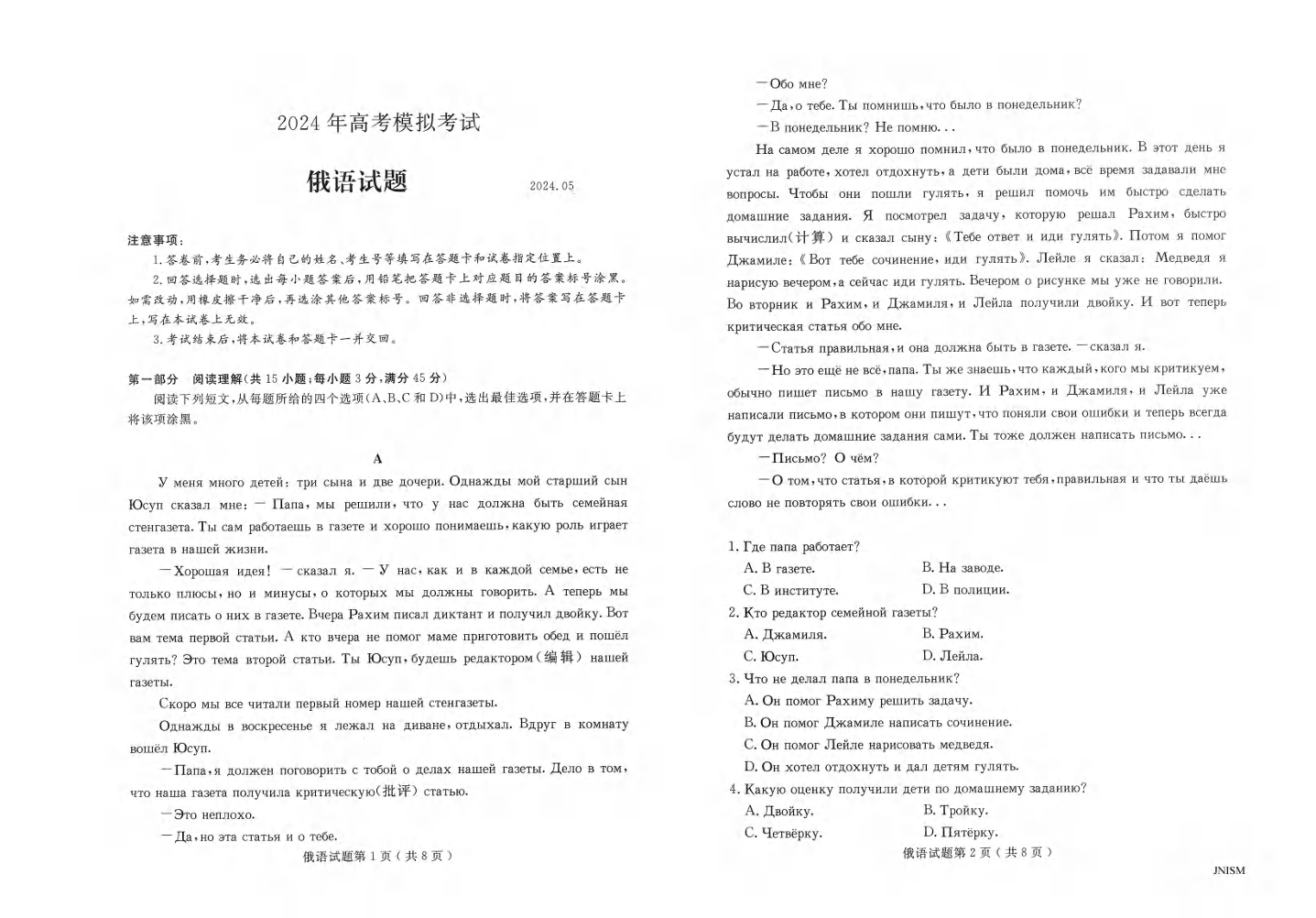 5山东省济宁市2024.5高三年级第三次模拟俄语
