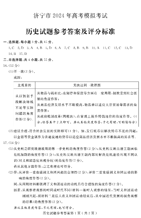山东省济宁市2024.5高三年级第三次模拟历史答案