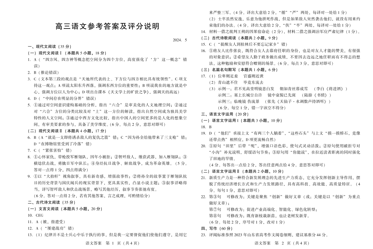山东省潍坊市2024.5高三年级第三次模拟语文答案