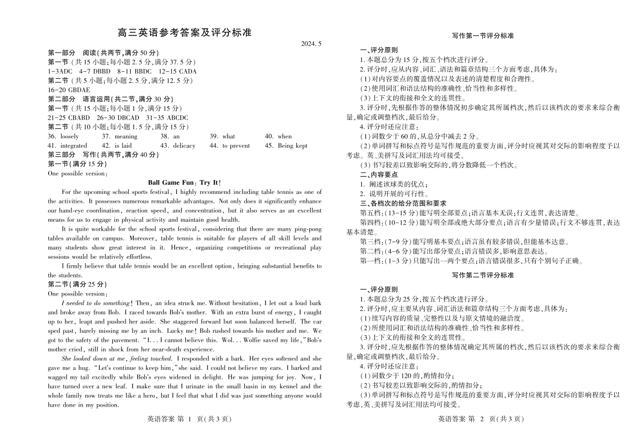 山东省潍坊市2024.5高三年级第三次模拟英语答案