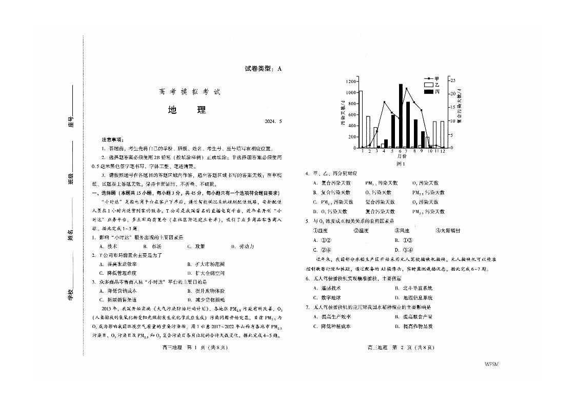山东省潍坊市2024.5高三年级第三次模拟地理