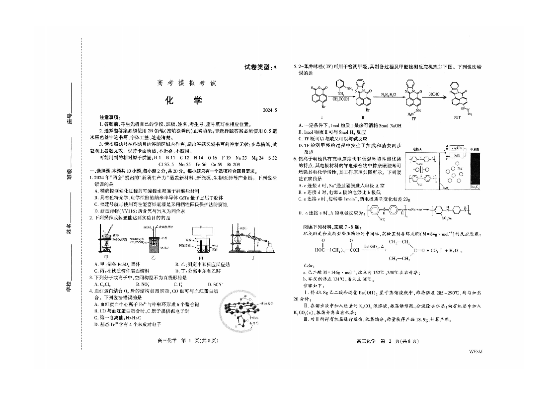 山东省潍坊市2024.5高三年级第三次模拟化学