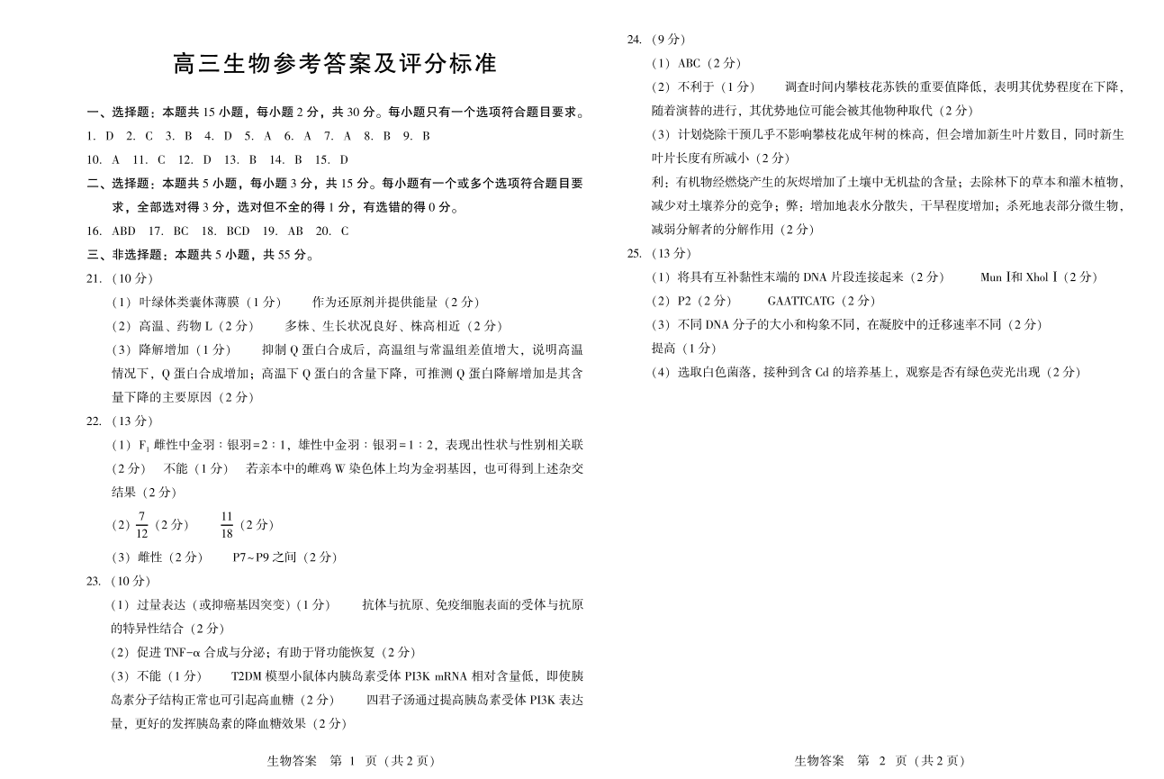 山东省潍坊市2024.5高三年级第三次模拟生物答案
