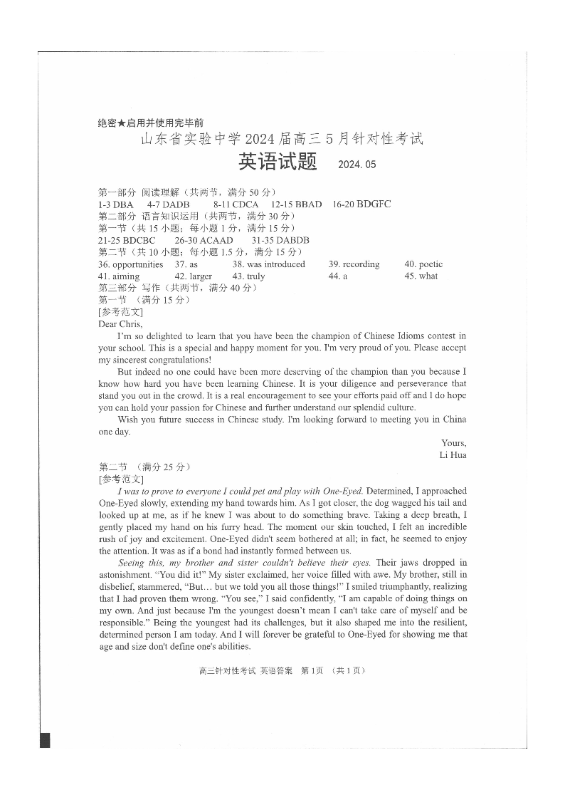 3山东省实验中学2024.5高三年级针对性考试英语答案