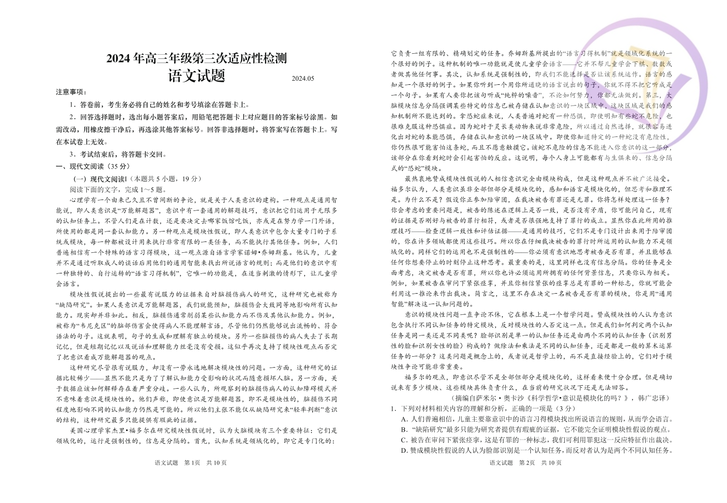 1山东省青岛市2024.5高三年级第三次模拟语文