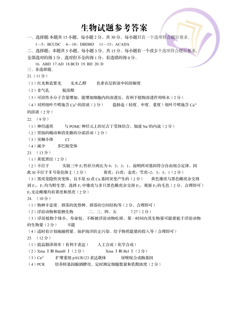 山东省青岛市2024.5高三年级第三次模拟生物答案