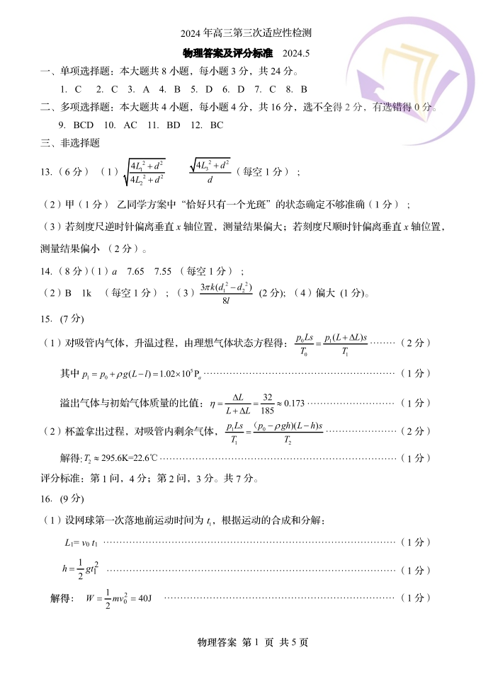山东省青岛市2024.5高三年级第三次模拟物理答案