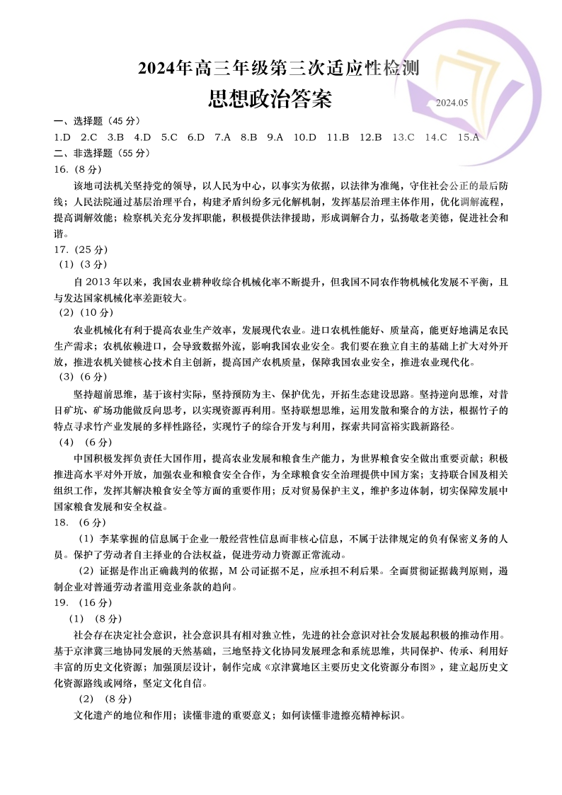 山东省青岛市2024.5高三年级第三次模拟政治答案