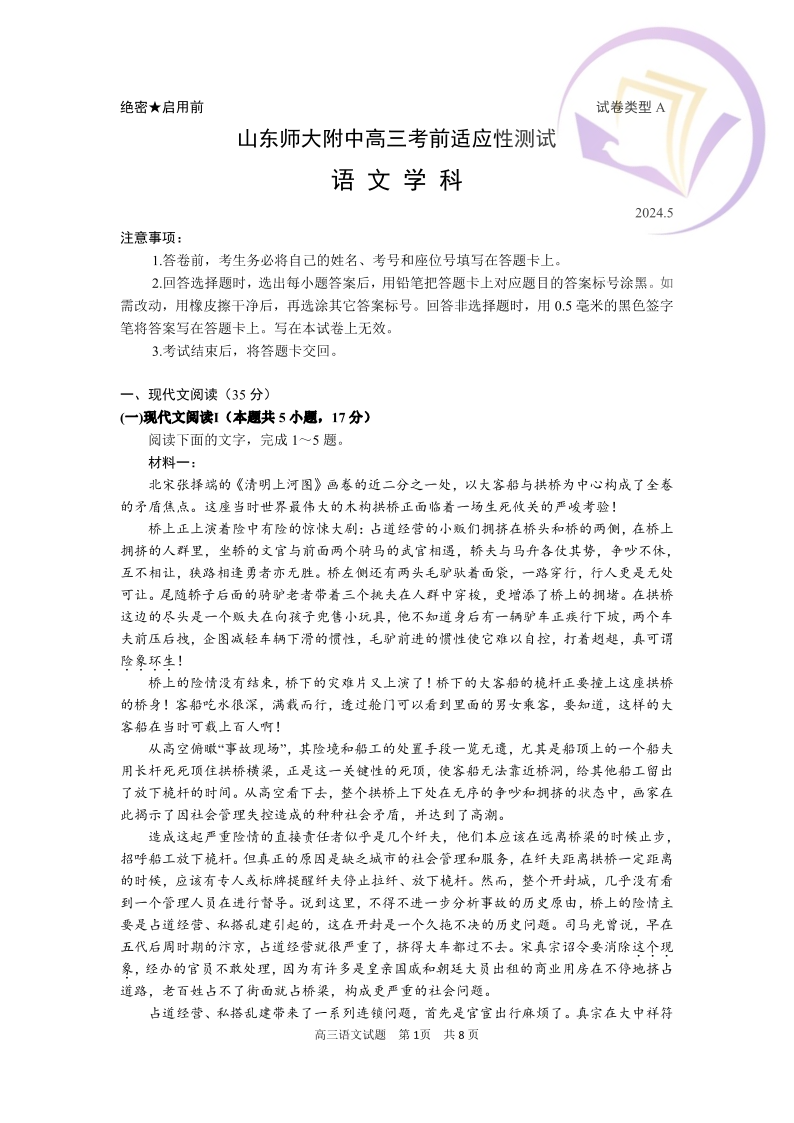 1山东省师大附中2024.6高三年级考前模拟语文