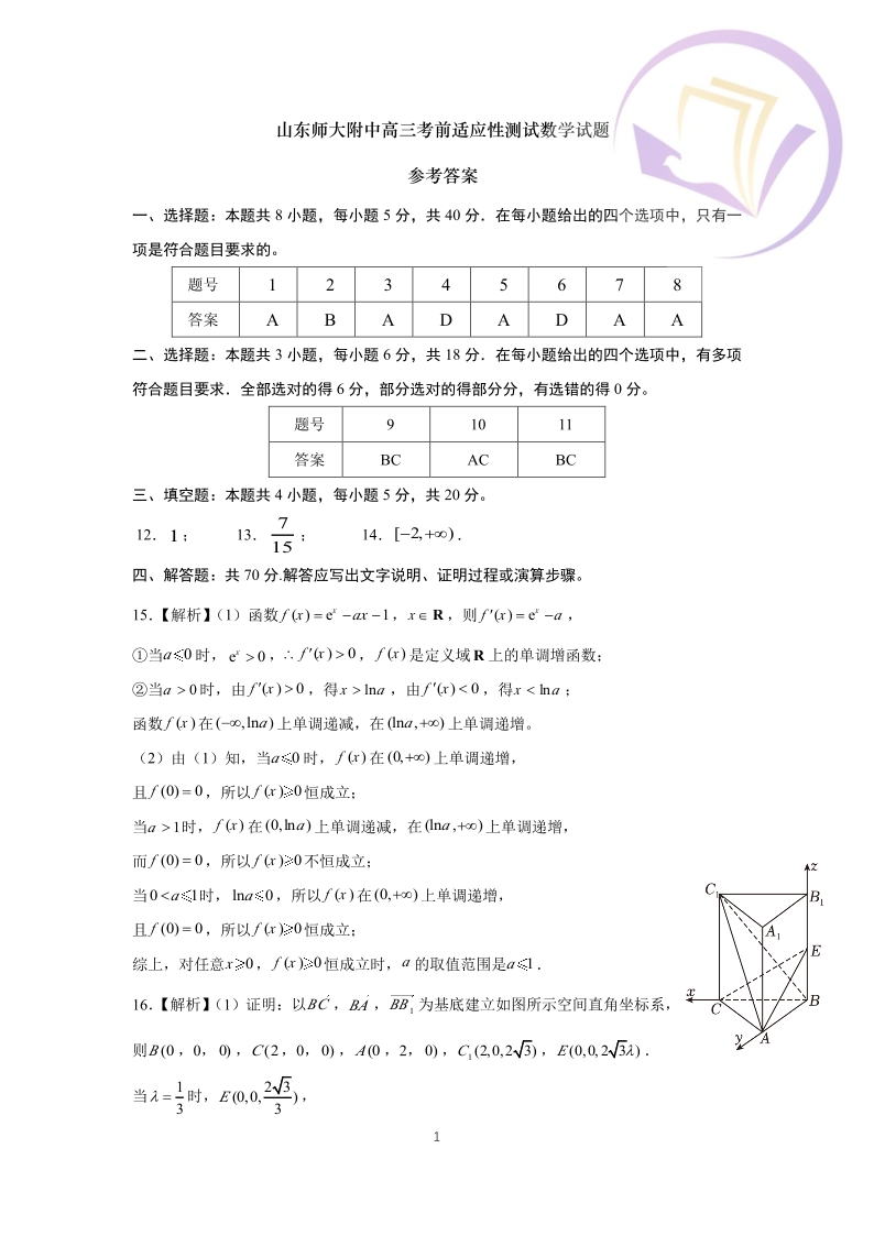 2山东省师大附中2024.6高三年级考前模拟数学答案