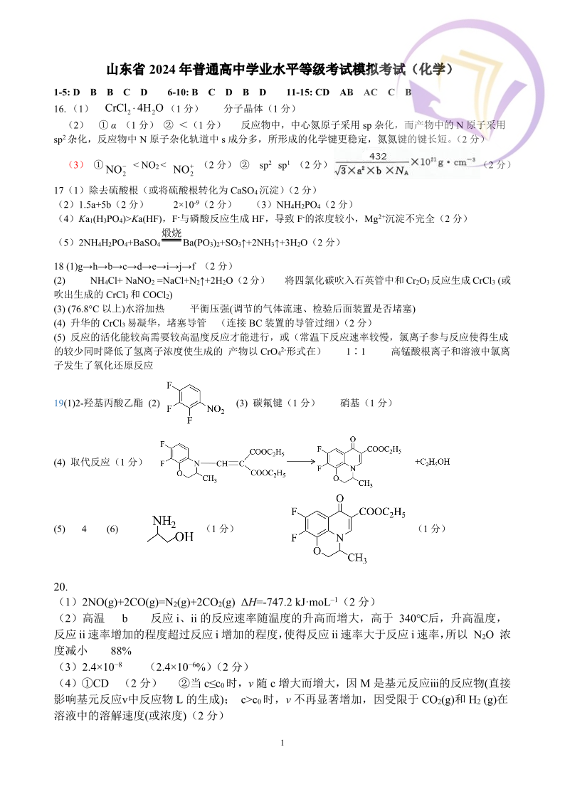 山东省师大附中2024.6高三年级考前模拟化学答案