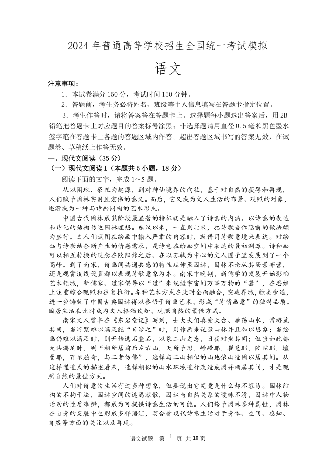 1山东省潍坊市区域2024.6高三年级考前热身卷语文