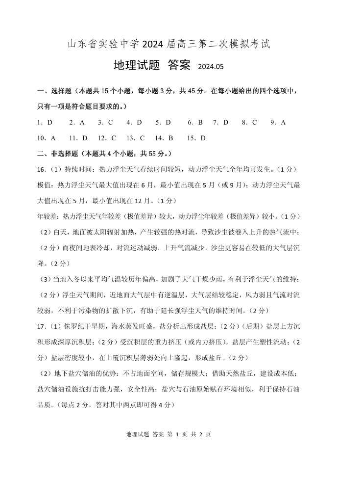 山东省实验中学2024.6高三年级考前模拟地理答案