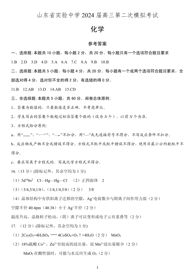 山东省实验中学2024.6高三年级考前模拟化学答案
