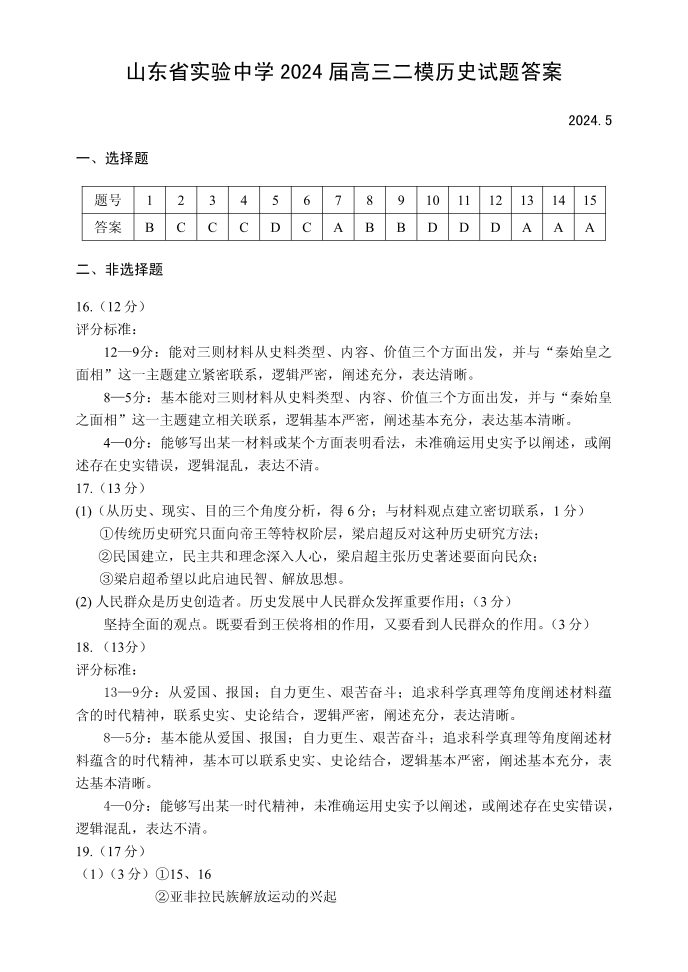 山东省实验中学2024.6高三年级考前模拟历史答案