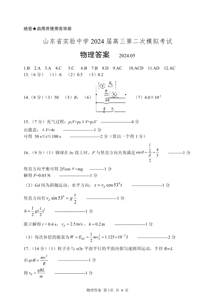 山东省实验中学2024.6高三年级考前模拟物理答案