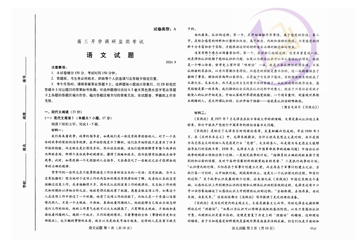 山东省潍坊市2024.9高三开学调研监测试题语文