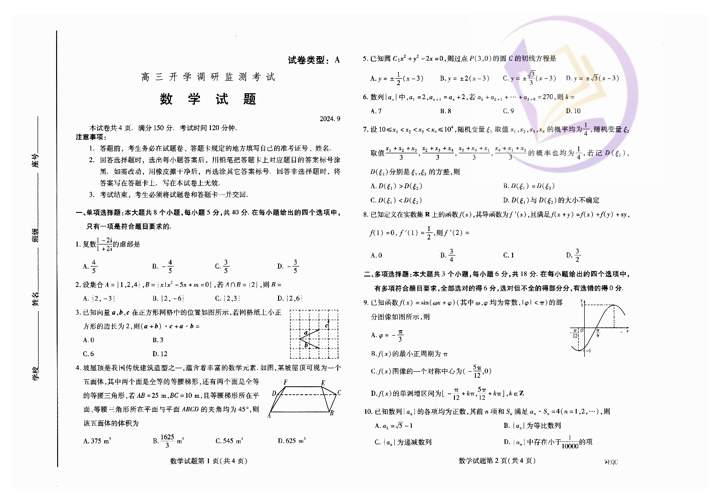 山东省潍坊市2024.9高三开学调研监测试题数学