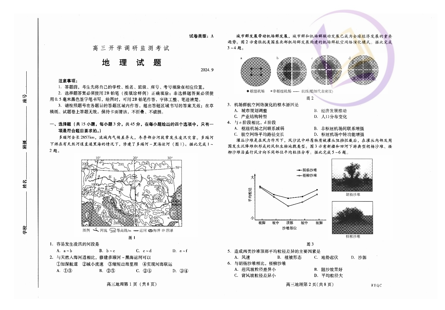 山东省潍坊市2024.9高三开学调研监测试题地理