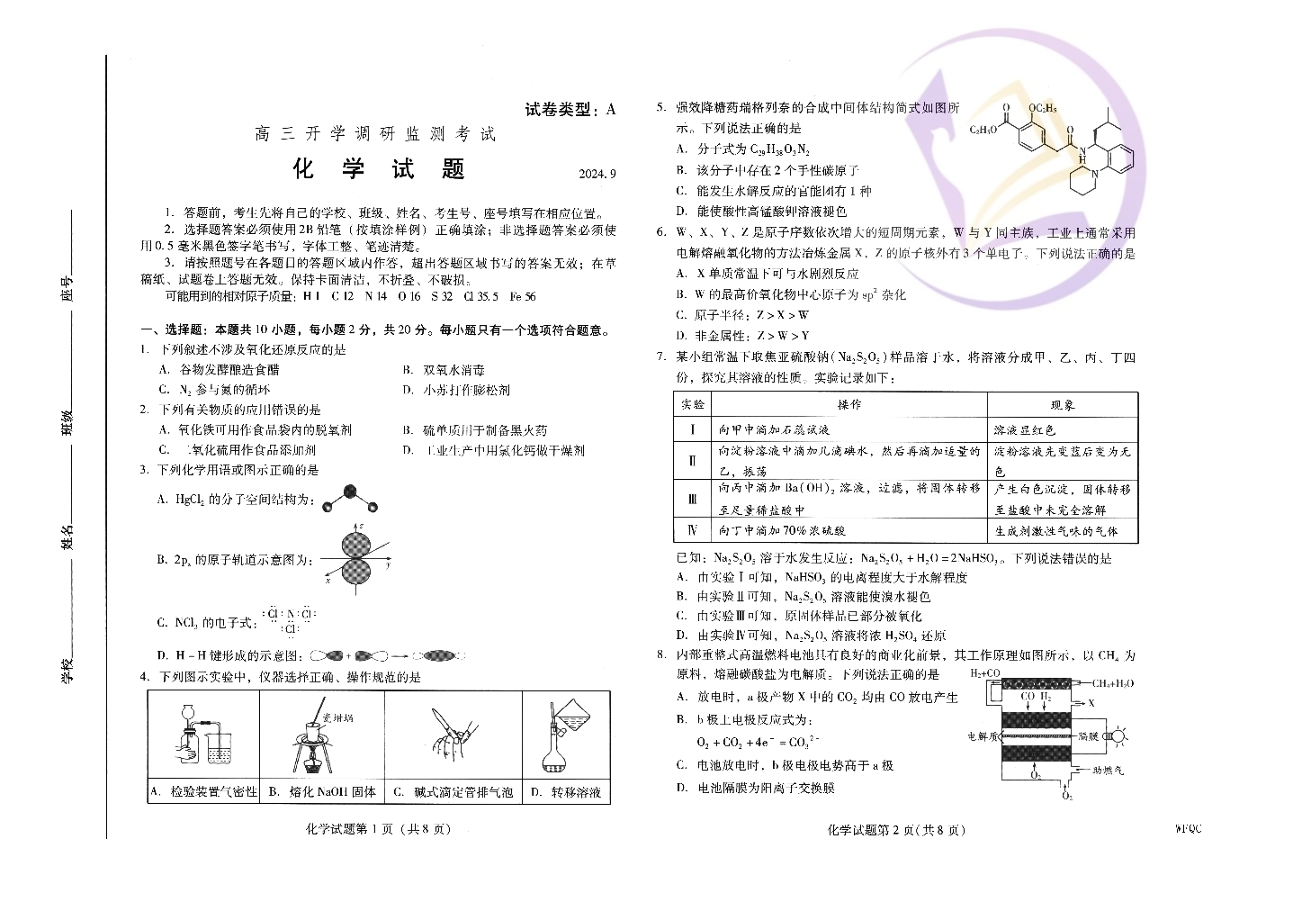 山东省潍坊市2024.9高三开学调研监测试题化学