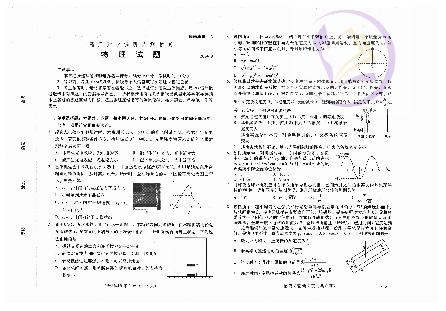 山东省潍坊市2024.9高三开学调研监测试题物理