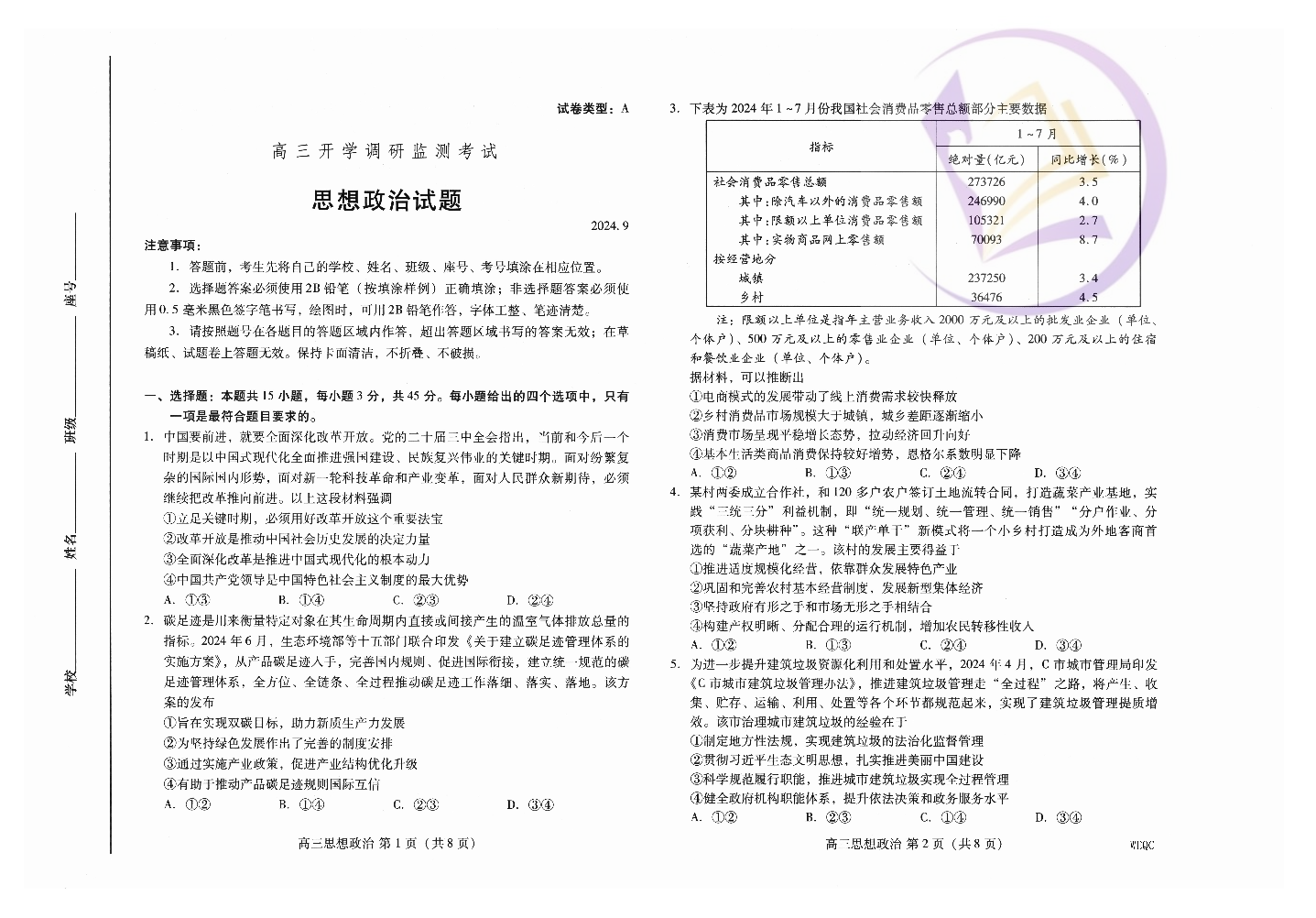 山东省潍坊市2024.9高三开学调研监测试题政治
