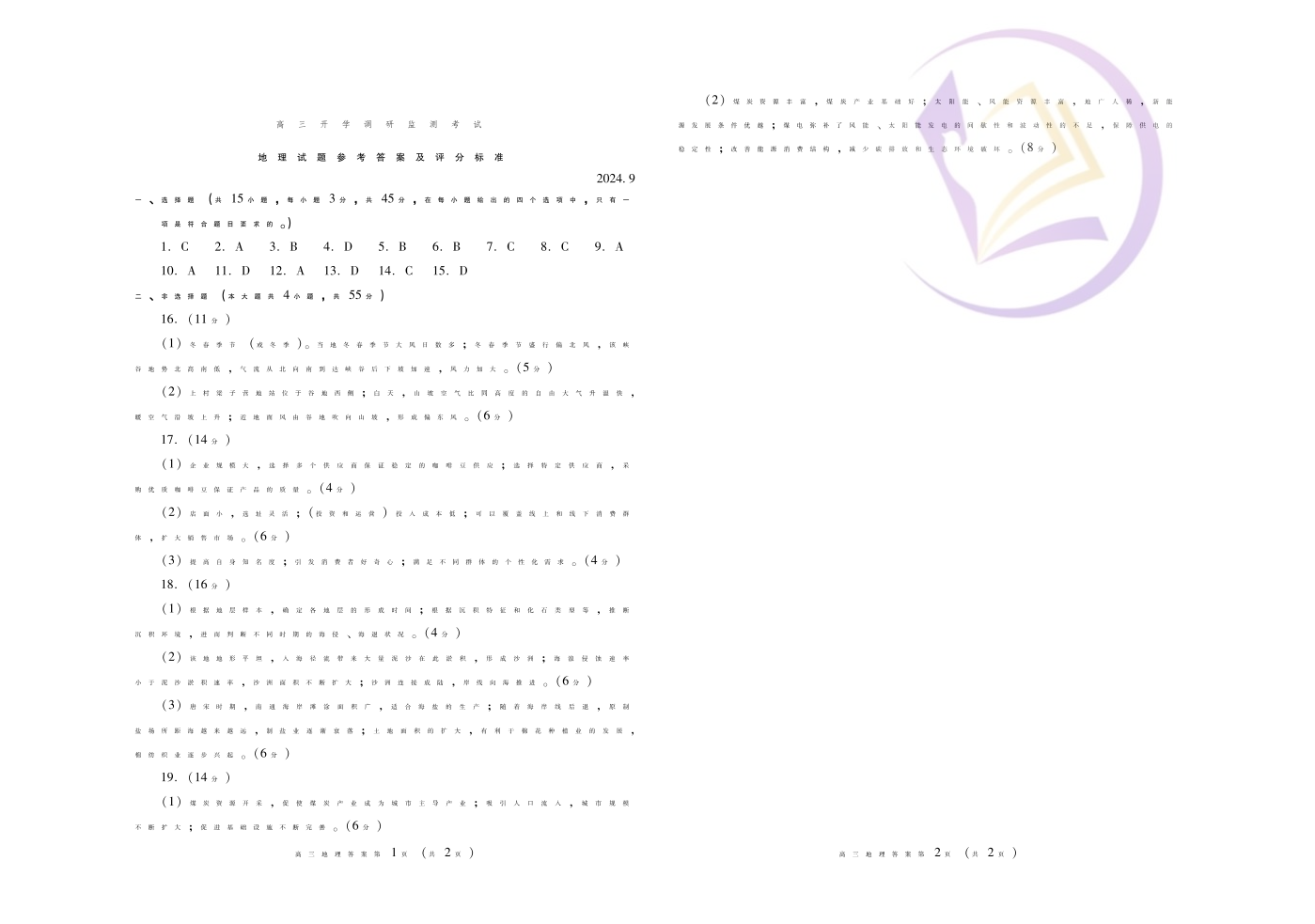 山东省潍坊市2024.9高三开学调研监测试题地理答案