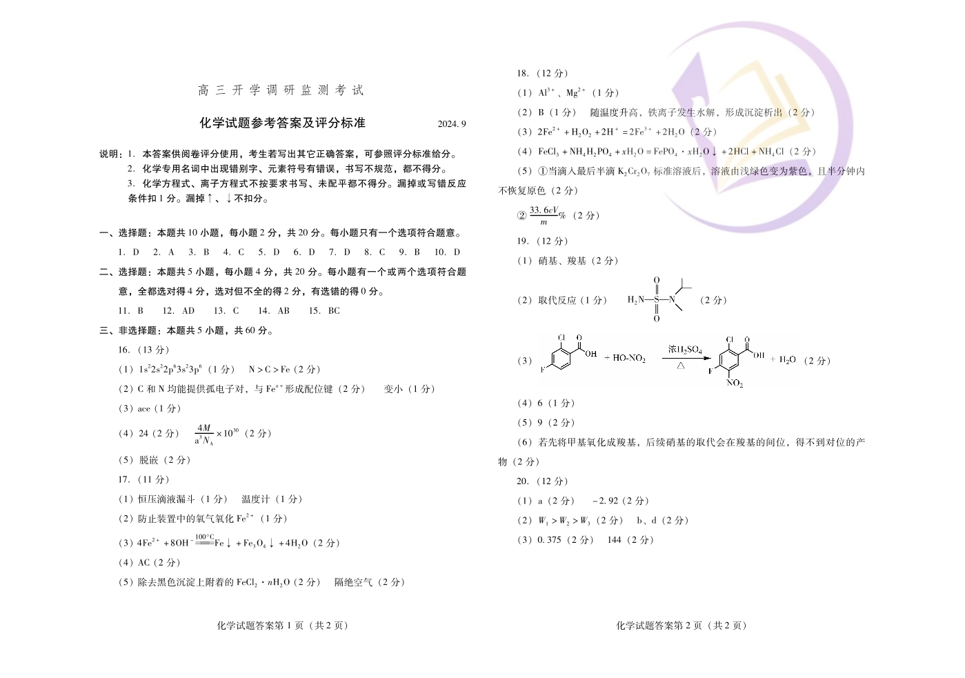 山东省潍坊市2024.9高三开学调研监测试题化学答案